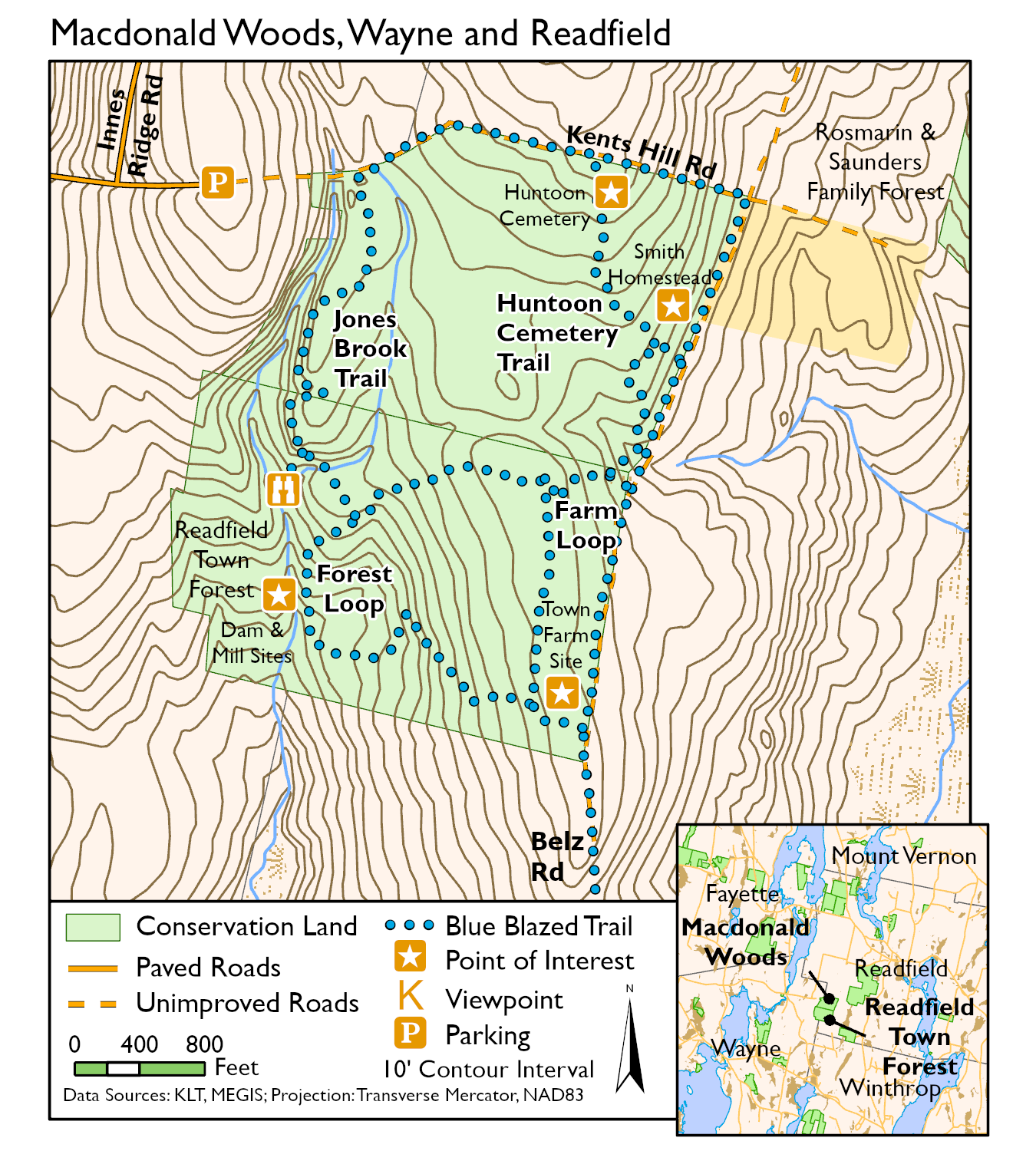 Directions: From Route 133 near Berry Pond, turn north on North Wayne Road for 3 miles to the T; turn right (east) on the Kents Hill Road; go 1 mile uphill (past the Innes Ridge Rd on left); look for a KLT sign, parking is on the left side of the road at the sign, please do not block the road or driveways. Hike downhill on the dirt road for 0.1 miles, look for a KLT sign and trailhead on the right after crossing Jones Brook.